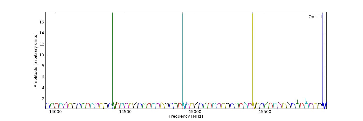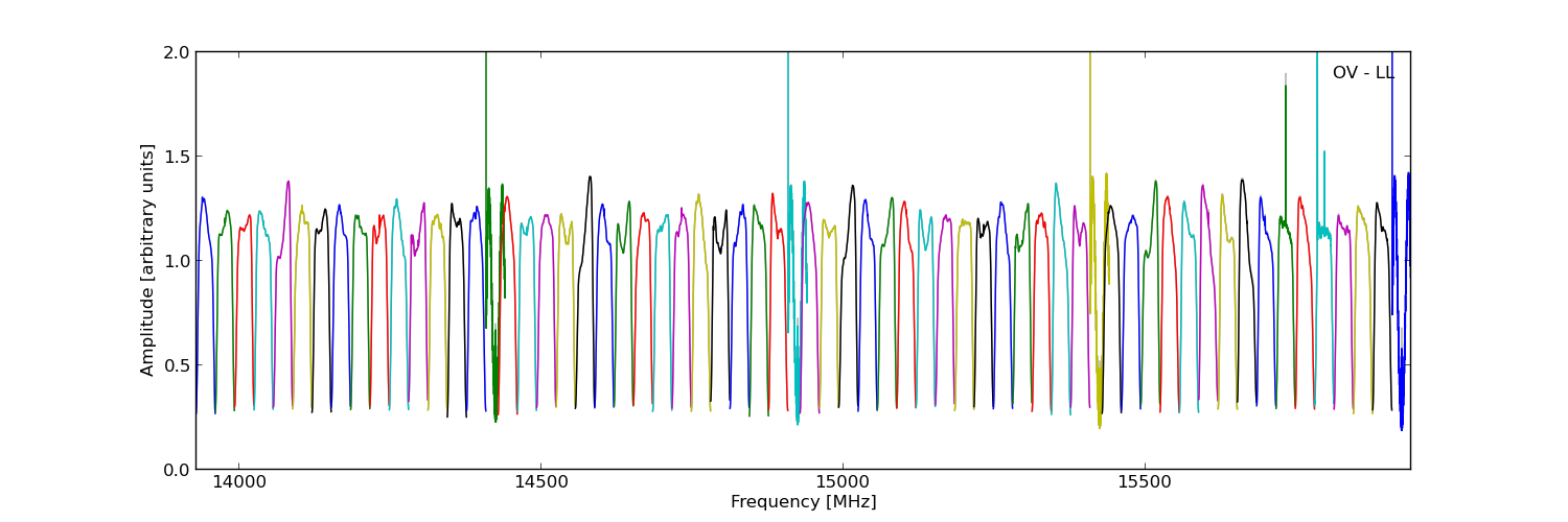 Total power spectrum in arbitrary units. The solid lines indicate the mean value and the shaded area the peaks.