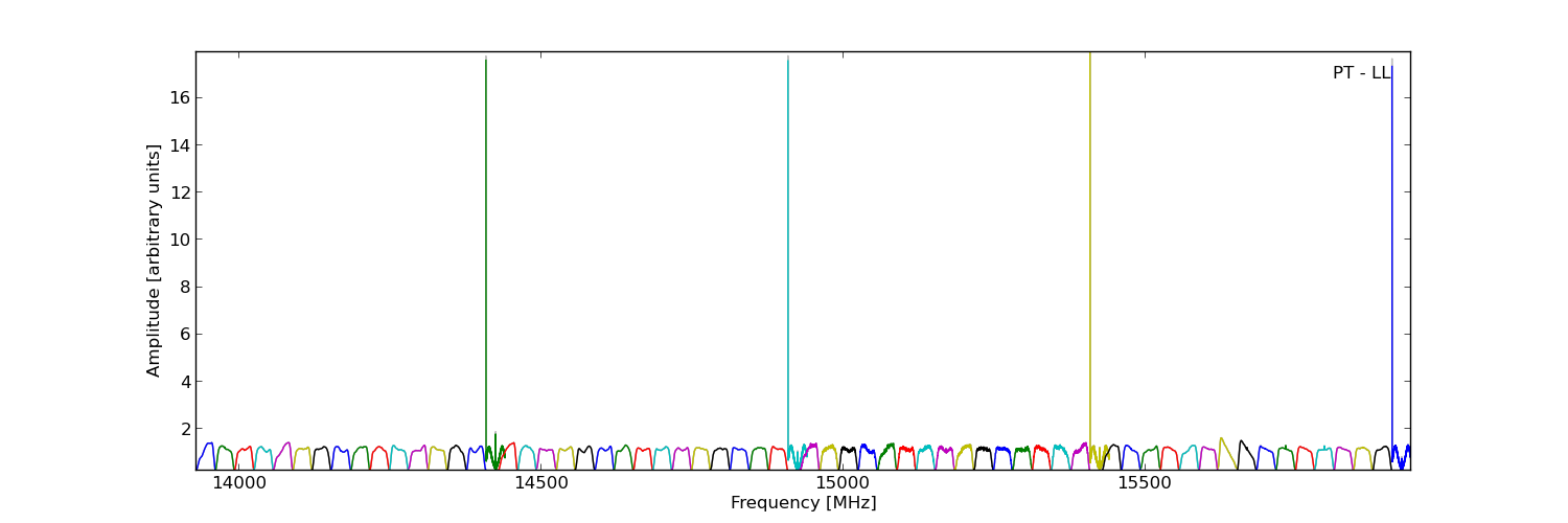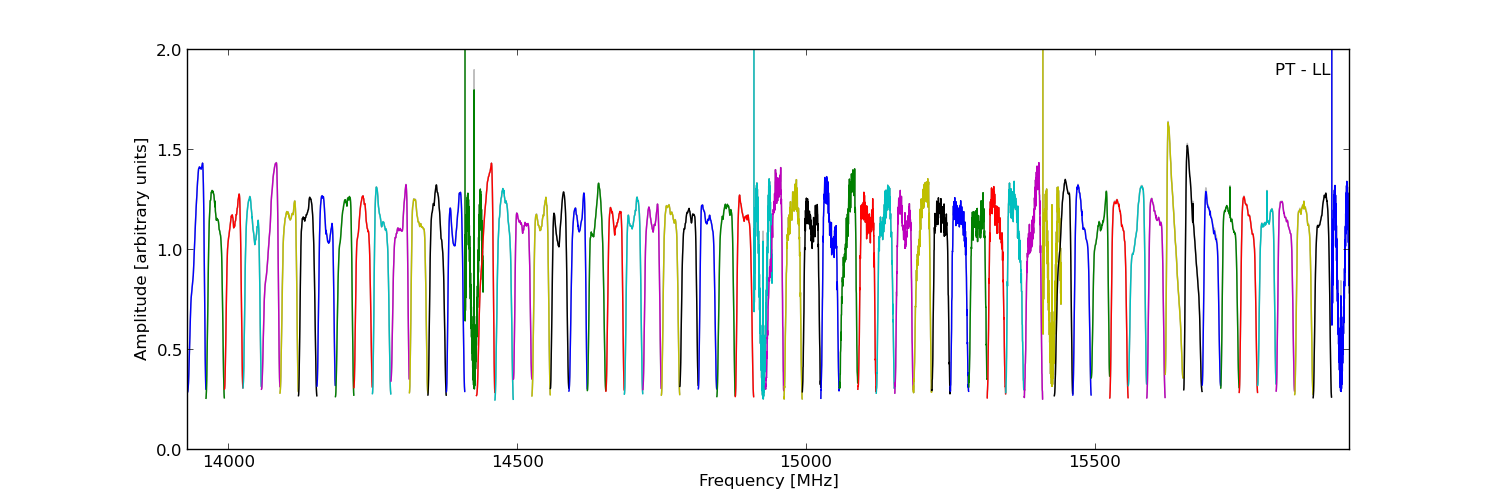 Total power spectrum in arbitrary units. The solid lines indicate the mean value and the shaded area the peaks.