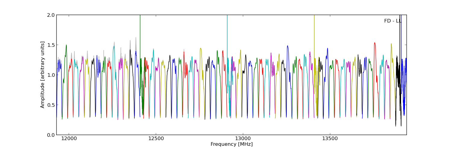 Total power spectrum in arbitrary units. The solid lines indicate the mean value and the shaded area the peaks.