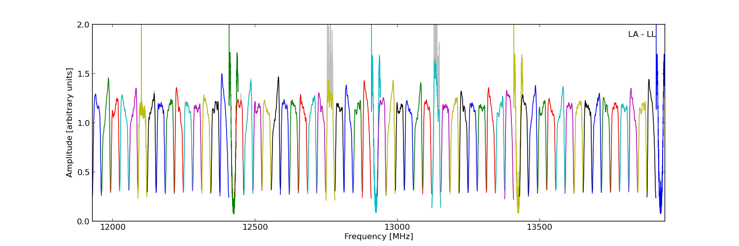 Total power spectrum in arbitrary units. The solid lines indicate the mean value and the shaded area the peaks.