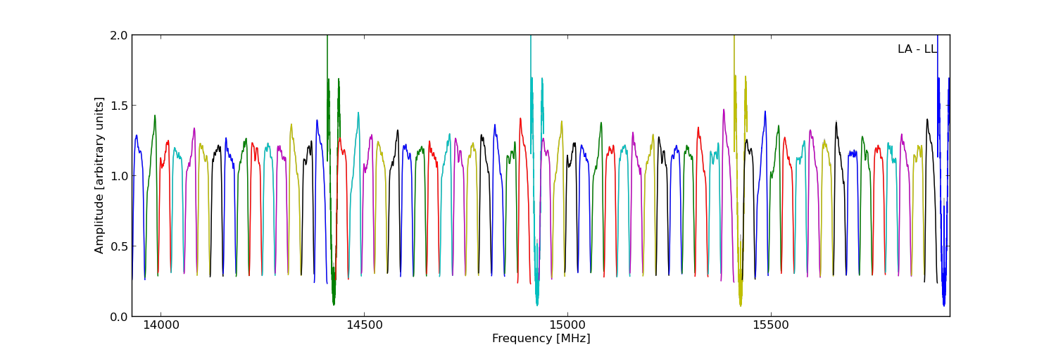 Total power spectrum in arbitrary units. The solid lines indicate the mean value and the shaded area the peaks.