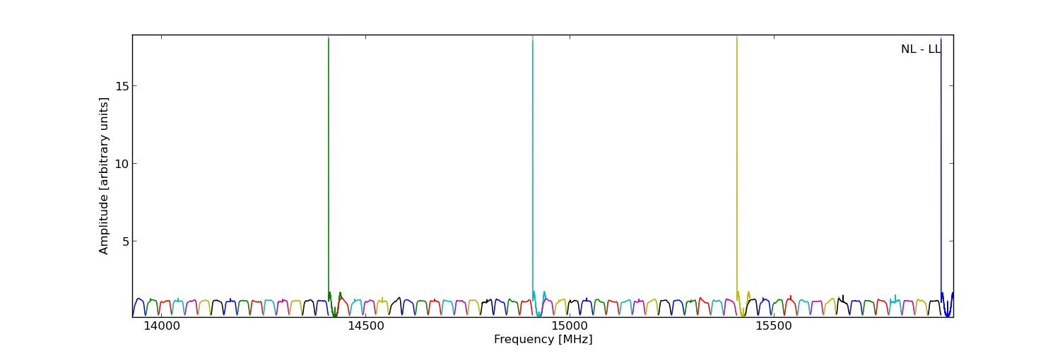 Total power spectrum in arbitrary units. The solid lines indicate the mean value and the shaded area the peaks.