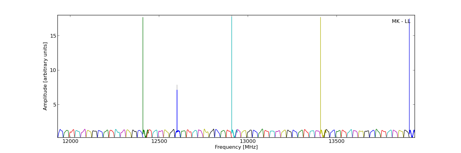 Total power spectrum in arbitrary units. The solid lines indicate the mean value and the shaded area the peaks.