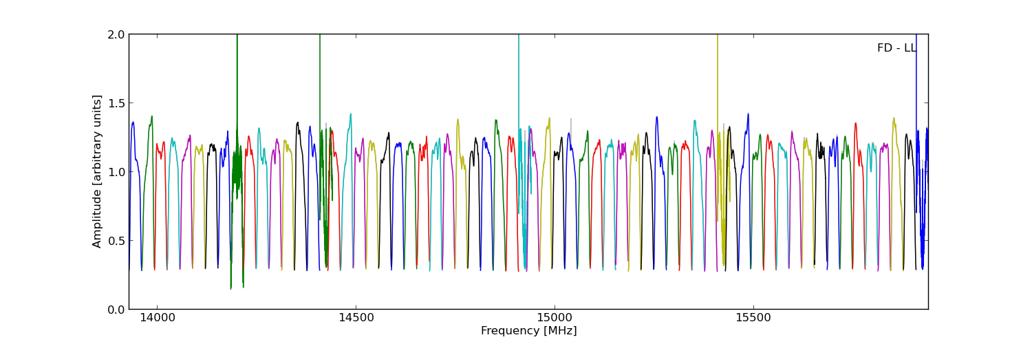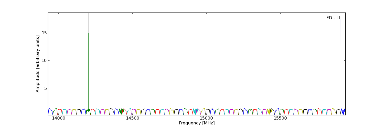 Total power spectrum in arbitrary units. The solid lines indicate the mean value and the shaded area the peaks.
