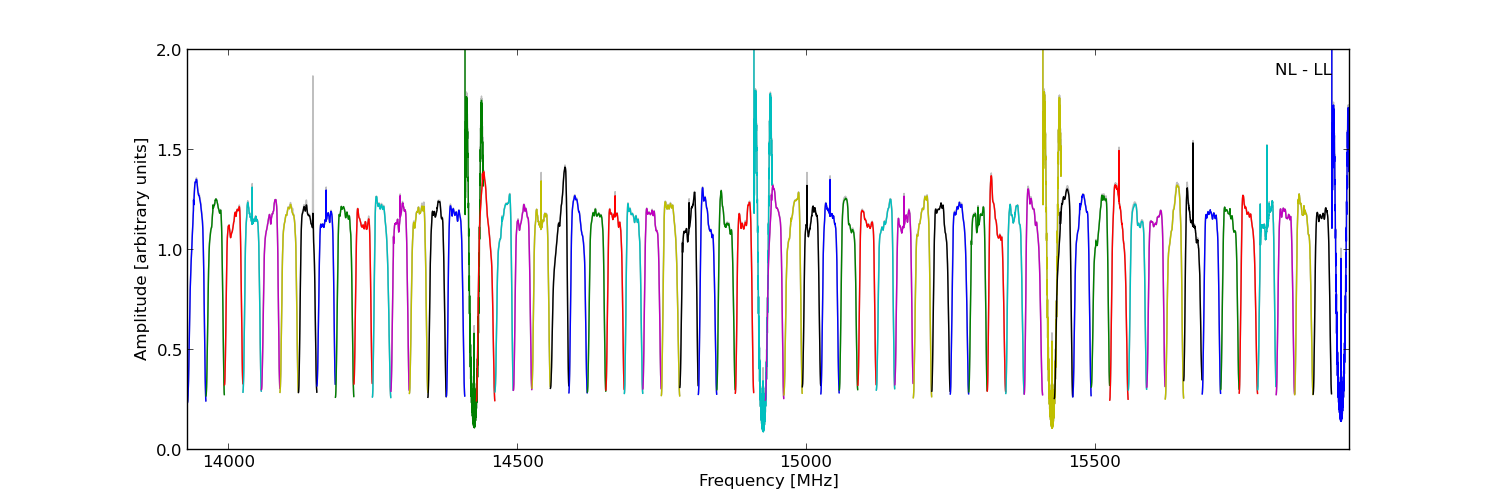 Total power spectrum in arbitrary units. The solid lines indicate the mean value and the shaded area the peaks.