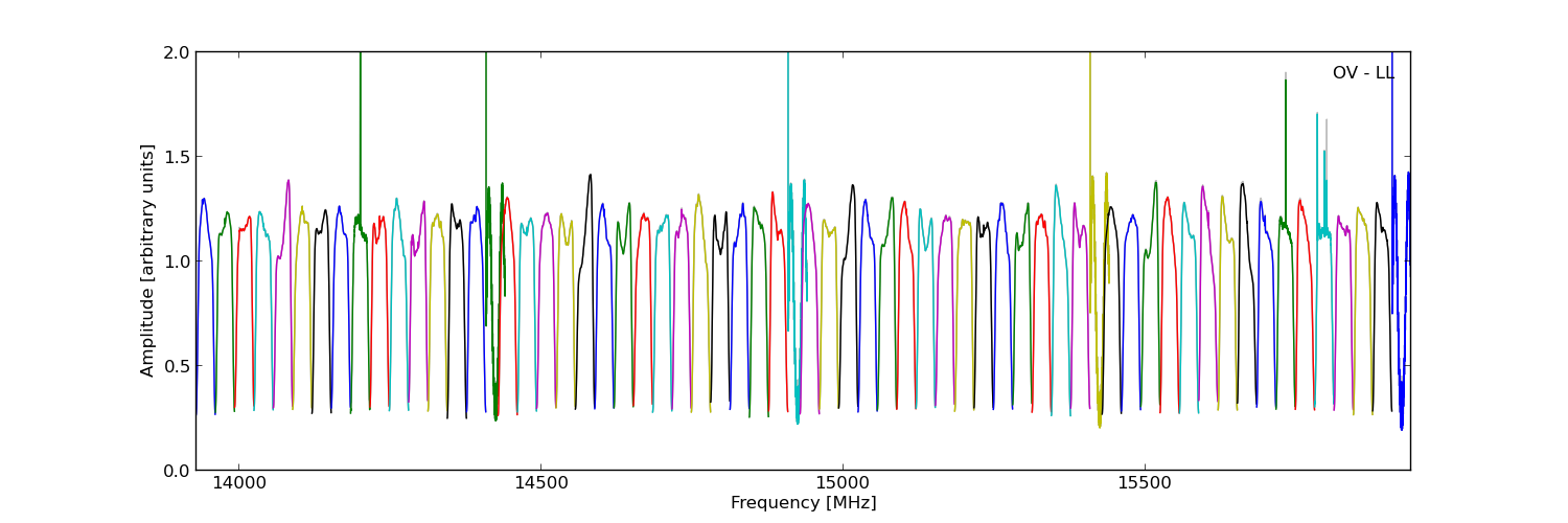 Total power spectrum in arbitrary units. The solid lines indicate the mean value and the shaded area the peaks.