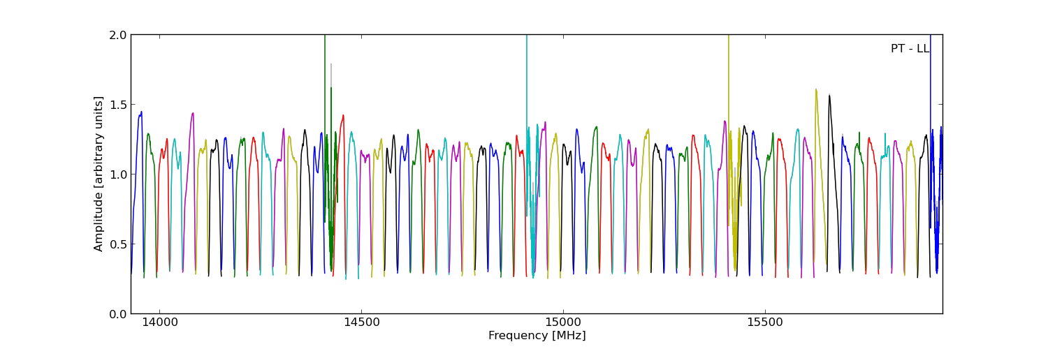 Total power spectrum in arbitrary units. The solid lines indicate the mean value and the shaded area the peaks.
