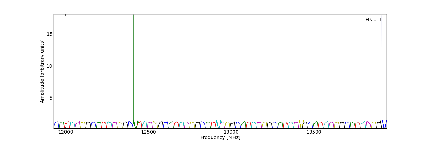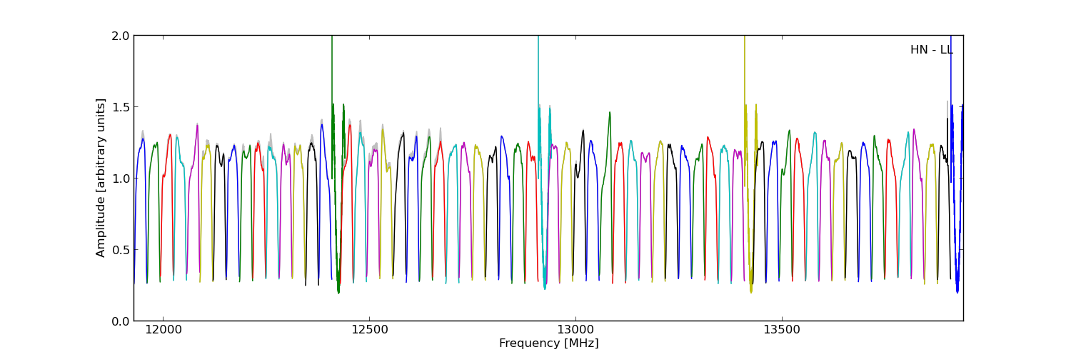 Total power spectrum in arbitrary units. The solid lines indicate the mean value and the shaded area the peaks.