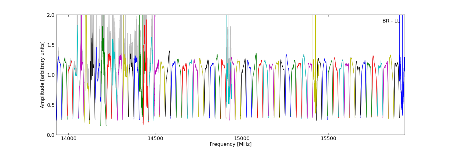 Total power spectrum in arbitrary units. The solid lines indicate the mean value and the shaded area the peaks.