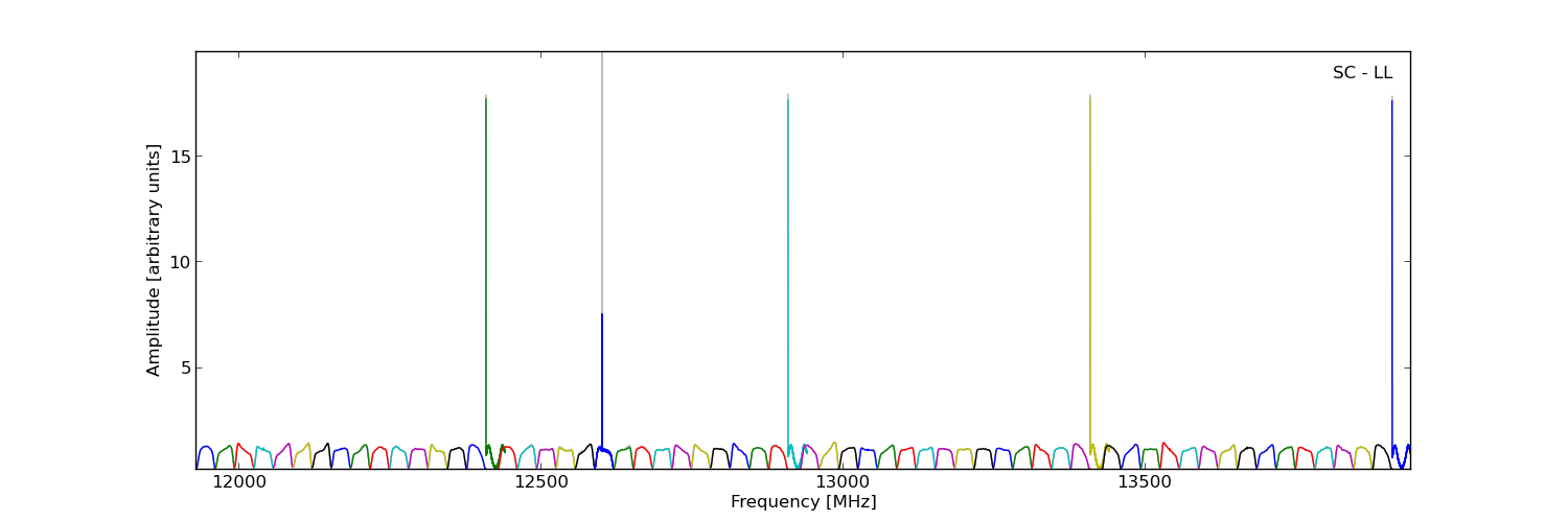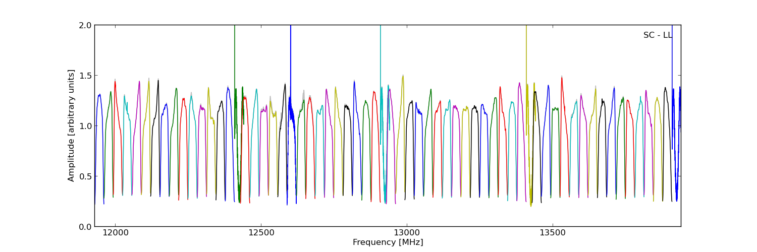 Total power spectrum in arbitrary units. The solid lines indicate the mean value and the shaded area the peaks.