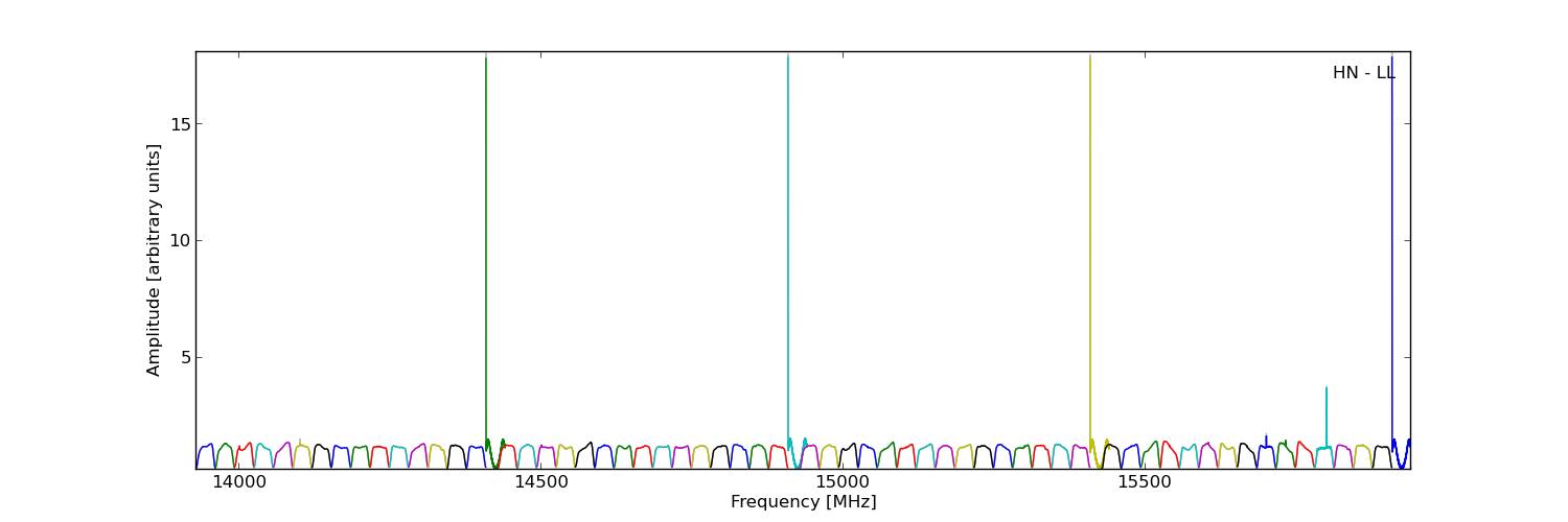 Total power spectrum in arbitrary units. The solid lines indicate the mean value and the shaded area the peaks.