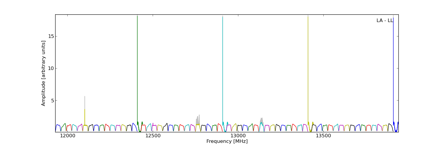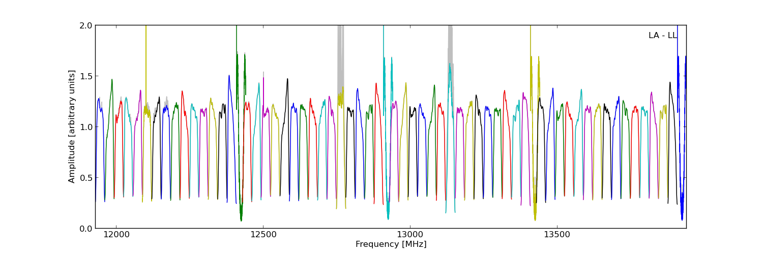 Total power spectrum in arbitrary units. The solid lines indicate the mean value and the shaded area the peaks.