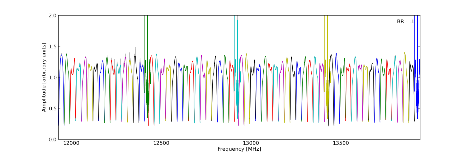 Total power spectrum in arbitrary units. The solid lines indicate the mean value and the shaded area the peaks.