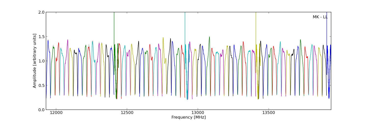 Total power spectrum in arbitrary units. The solid lines indicate the mean value and the shaded area the peaks.