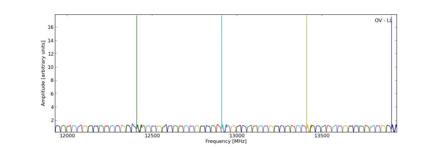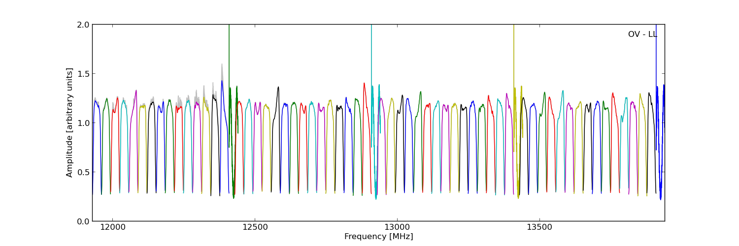 Total power spectrum in arbitrary units. The solid lines indicate the mean value and the shaded area the peaks.