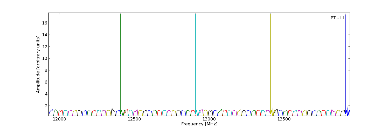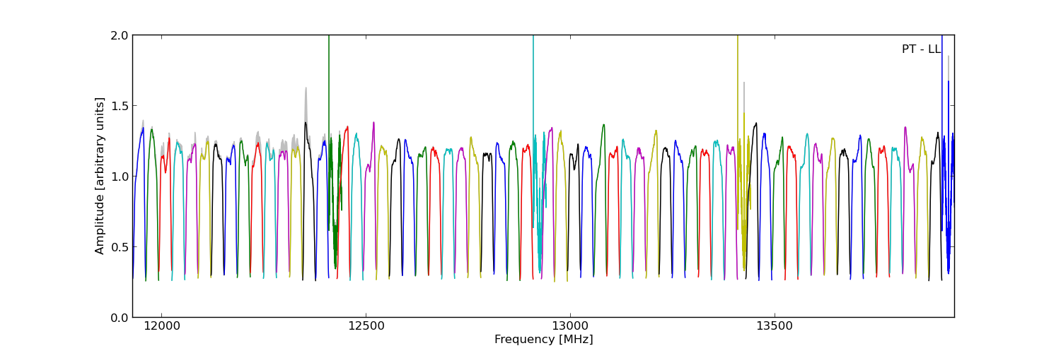 Total power spectrum in arbitrary units. The solid lines indicate the mean value and the shaded area the peaks.