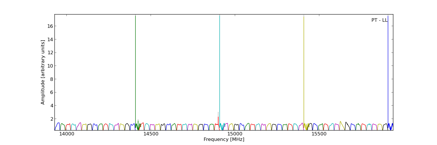 Total power spectrum in arbitrary units. The solid lines indicate the mean value and the shaded area the peaks.