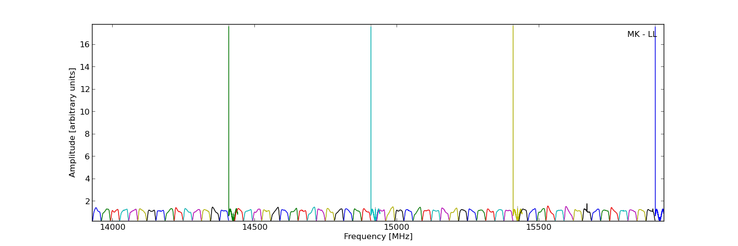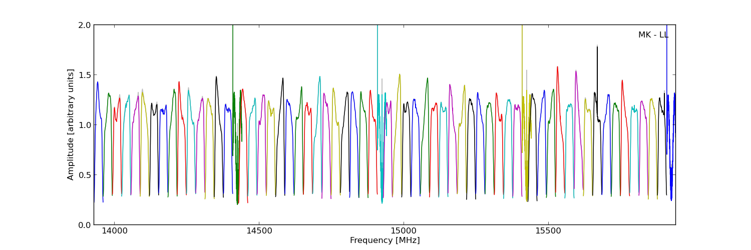 Total power spectrum in arbitrary units. The solid lines indicate the mean value and the shaded area the peaks.