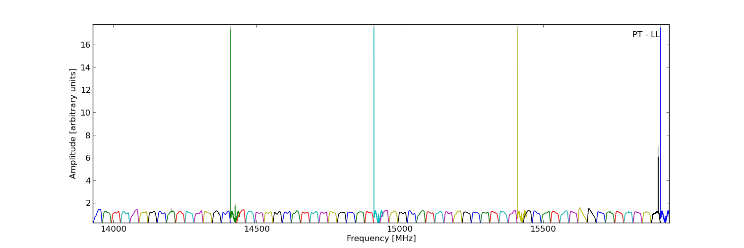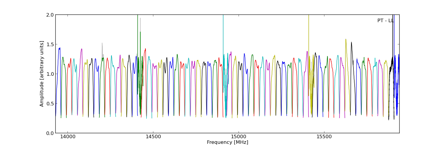 Total power spectrum in arbitrary units. The solid lines indicate the mean value and the shaded area the peaks.
