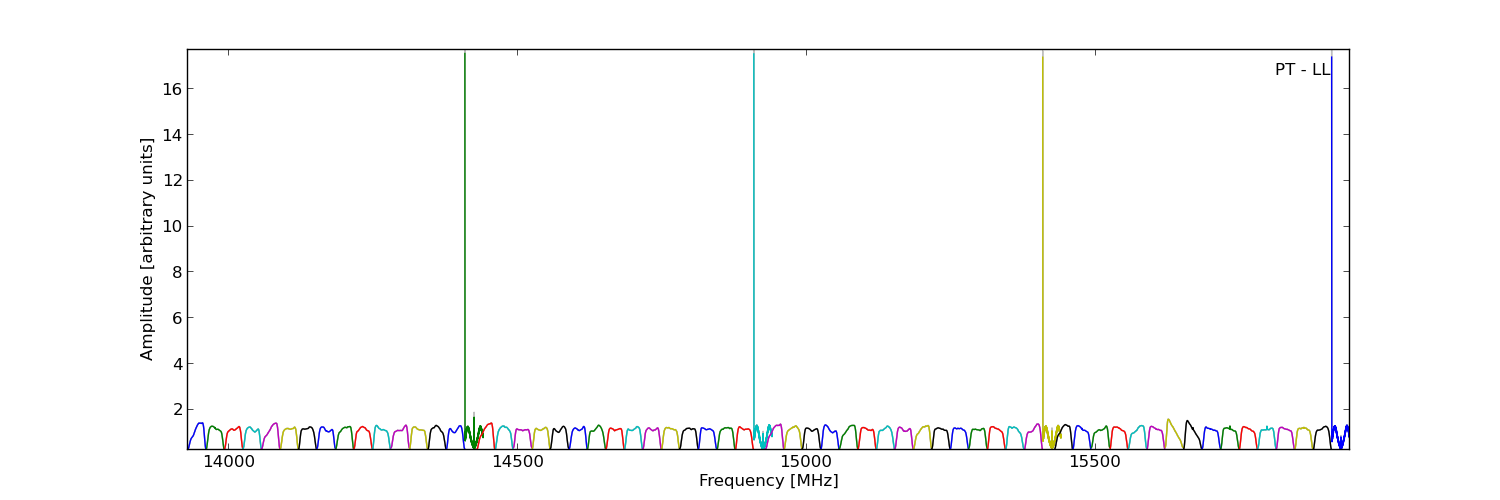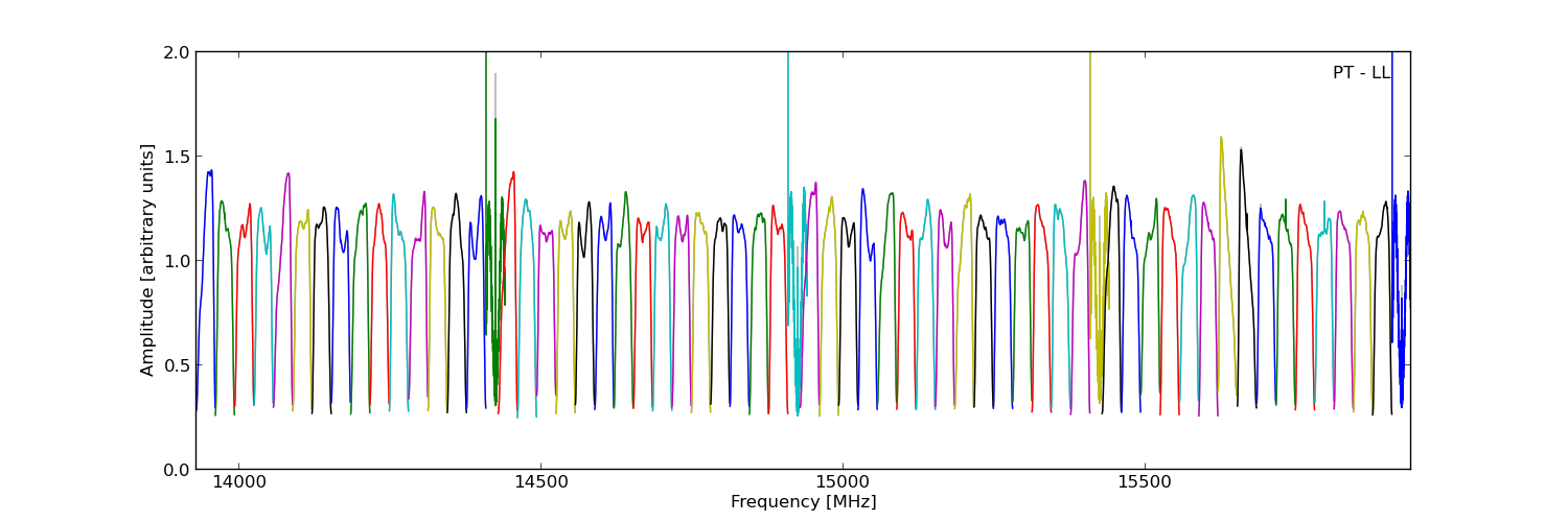 Total power spectrum in arbitrary units. The solid lines indicate the mean value and the shaded area the peaks.