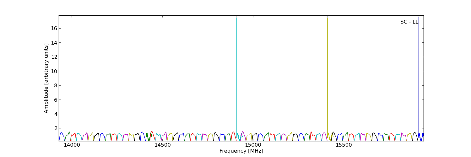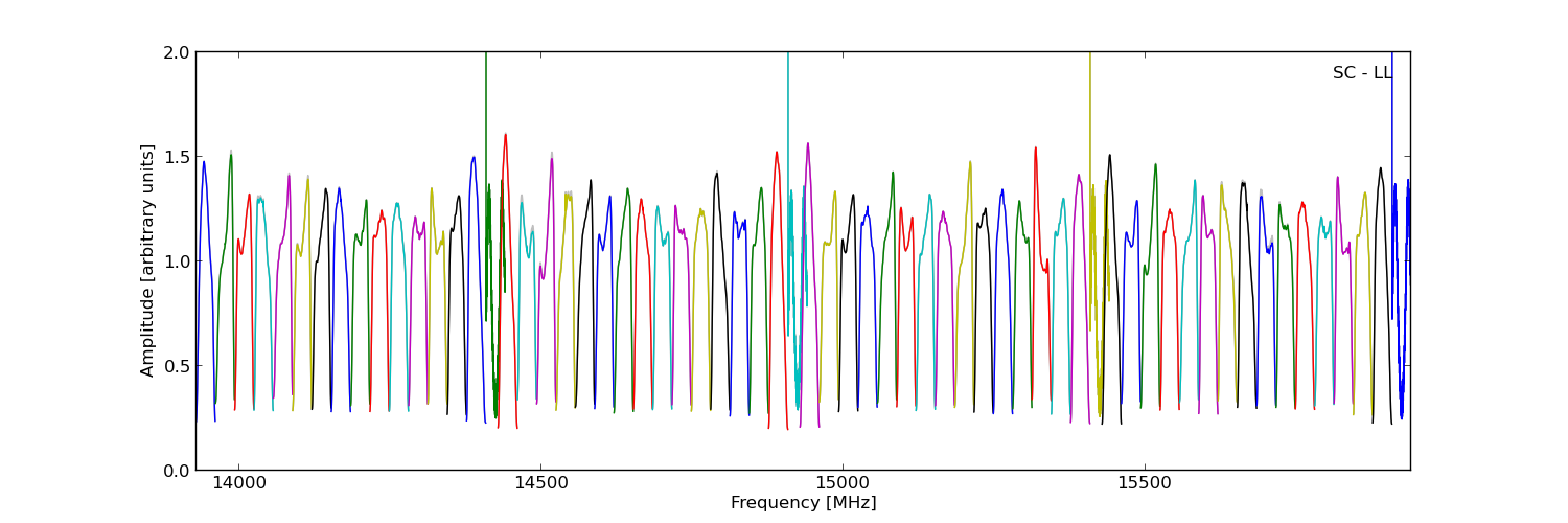 Total power spectrum in arbitrary units. The solid lines indicate the mean value and the shaded area the peaks.