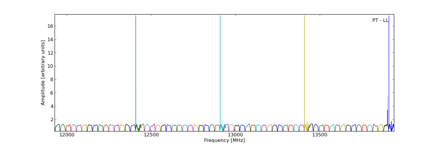 Total power spectrum in arbitrary units. The solid lines indicate the mean value and the shaded area the peaks.