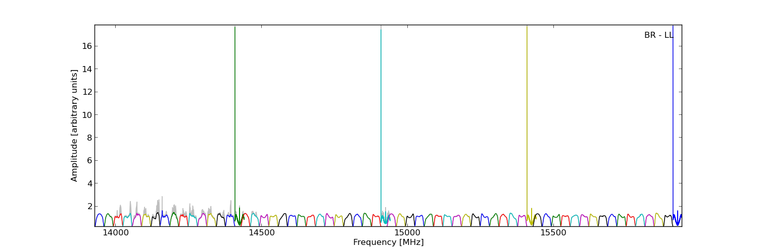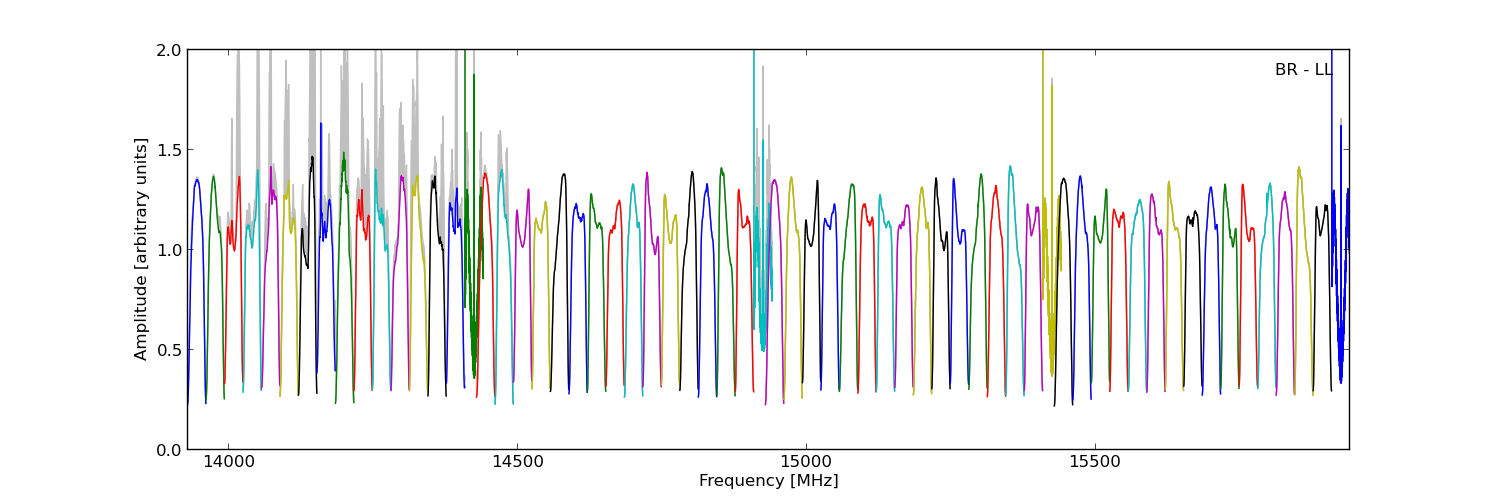 Total power spectrum in arbitrary units. The solid lines indicate the mean value and the shaded area the peaks.