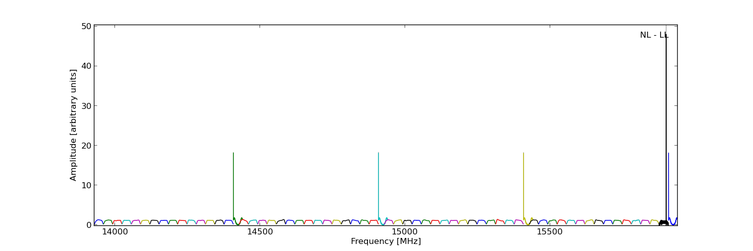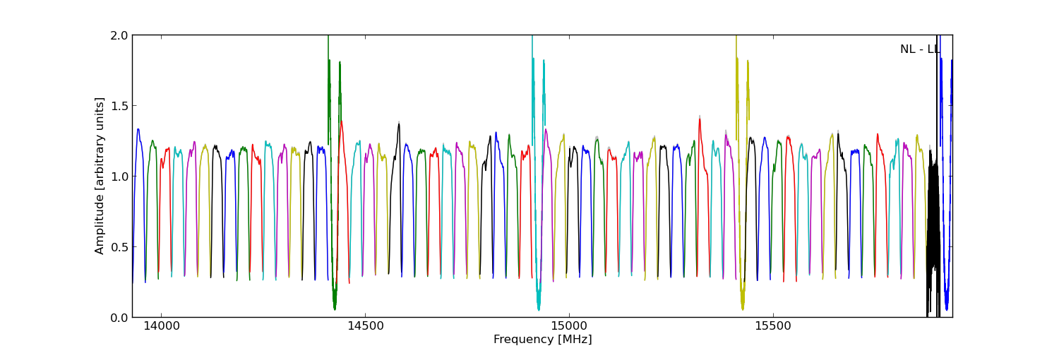 Total power spectrum in arbitrary units. The solid lines indicate the mean value and the shaded area the peaks.