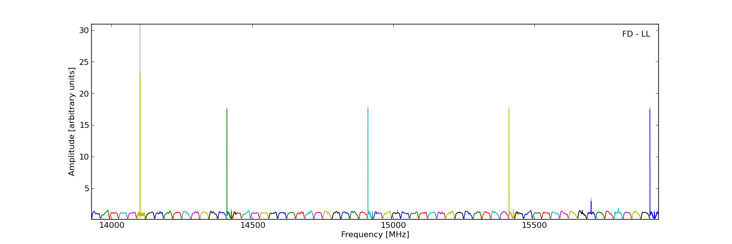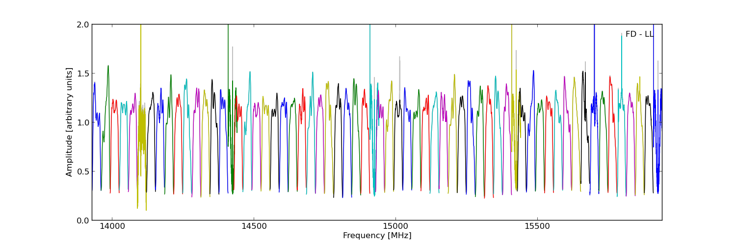 Total power spectrum in arbitrary units. The solid lines indicate the mean value and the shaded area the peaks.