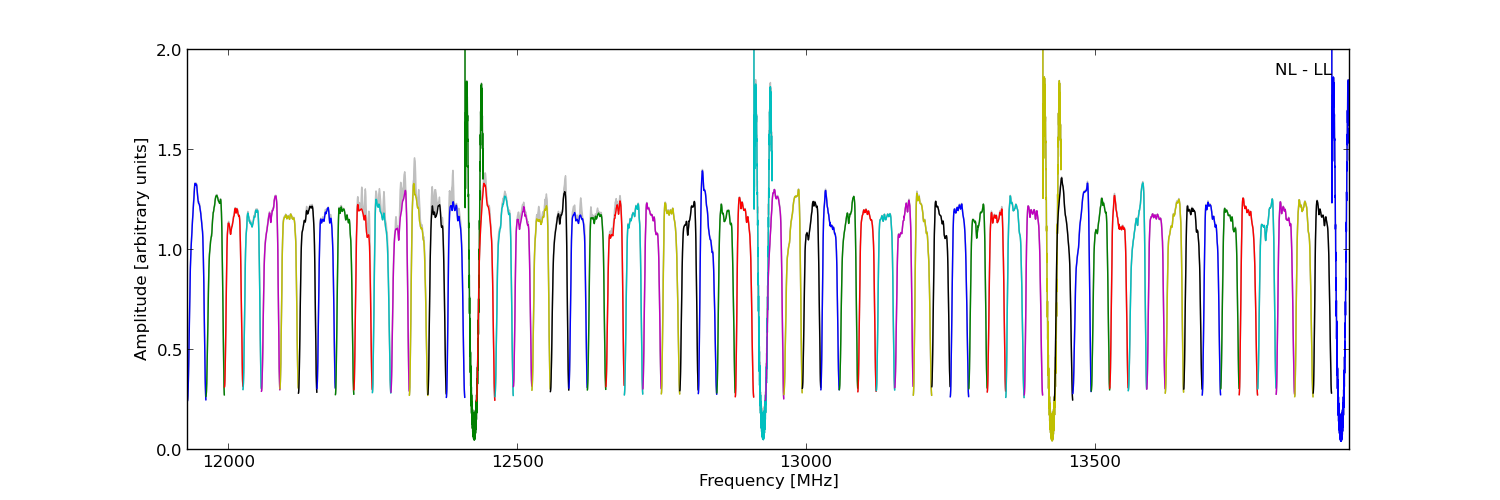 Total power spectrum in arbitrary units. The solid lines indicate the mean value and the shaded area the peaks.