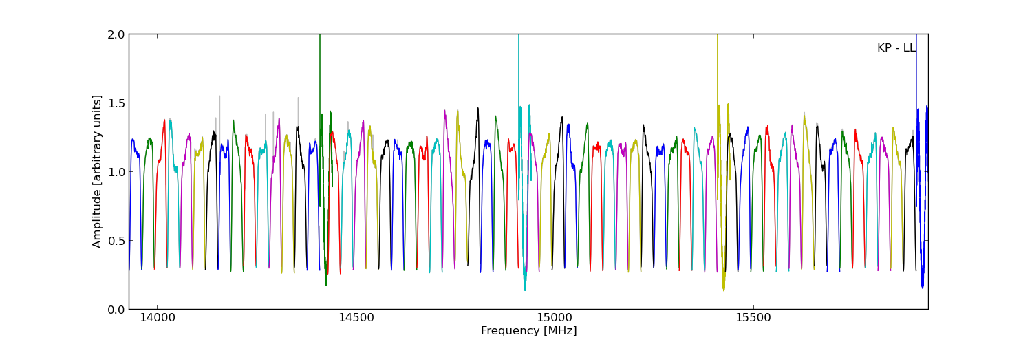 Total power spectrum in arbitrary units. The solid lines indicate the mean value and the shaded area the peaks.