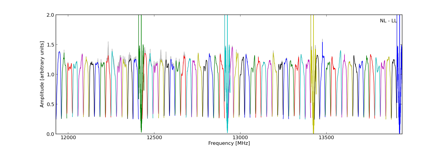 Total power spectrum in arbitrary units. The solid lines indicate the mean value and the shaded area the peaks.
