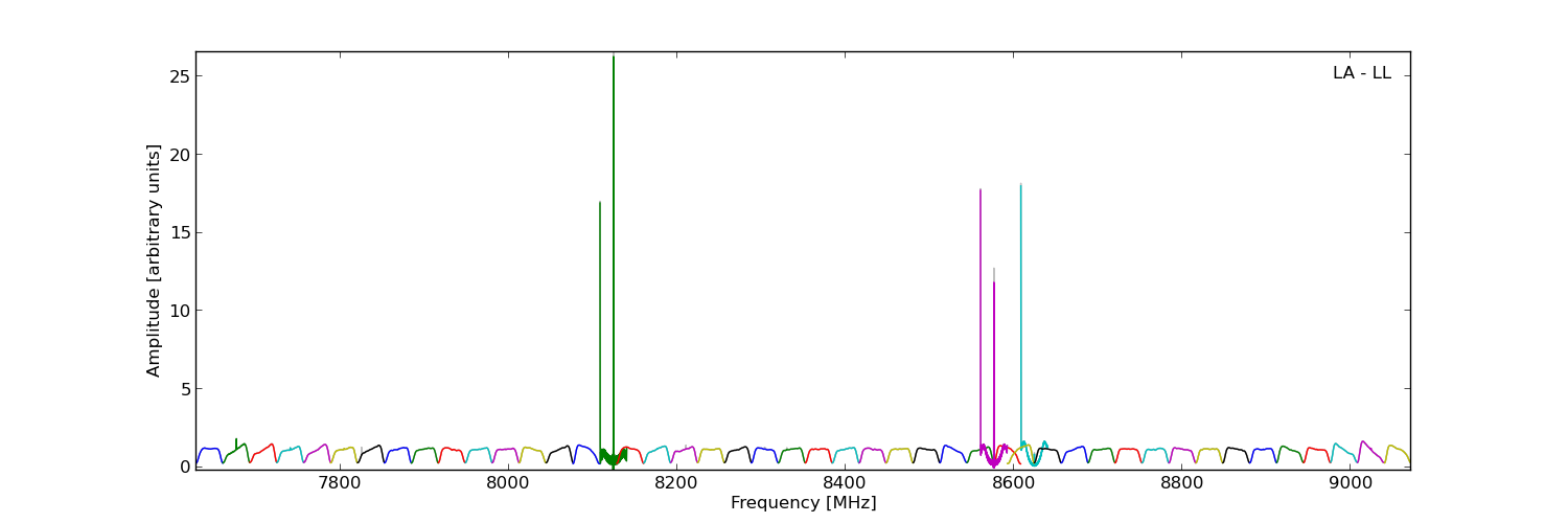 Total power spectrum in arbitrary units. The solid lines indicate the mean value and the shaded area the peaks.