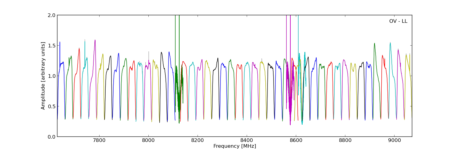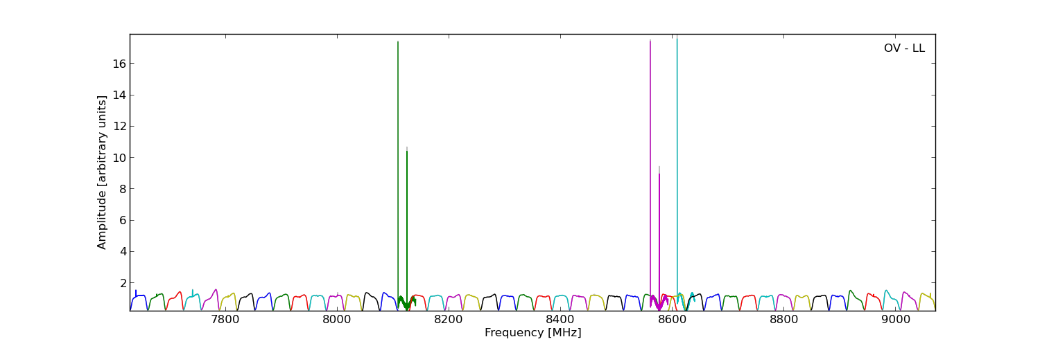 Total power spectrum in arbitrary units. The solid lines indicate the mean value and the shaded area the peaks.