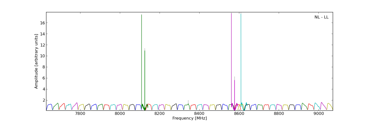 Total power spectrum in arbitrary units. The solid lines indicate the mean value and the shaded area the peaks.