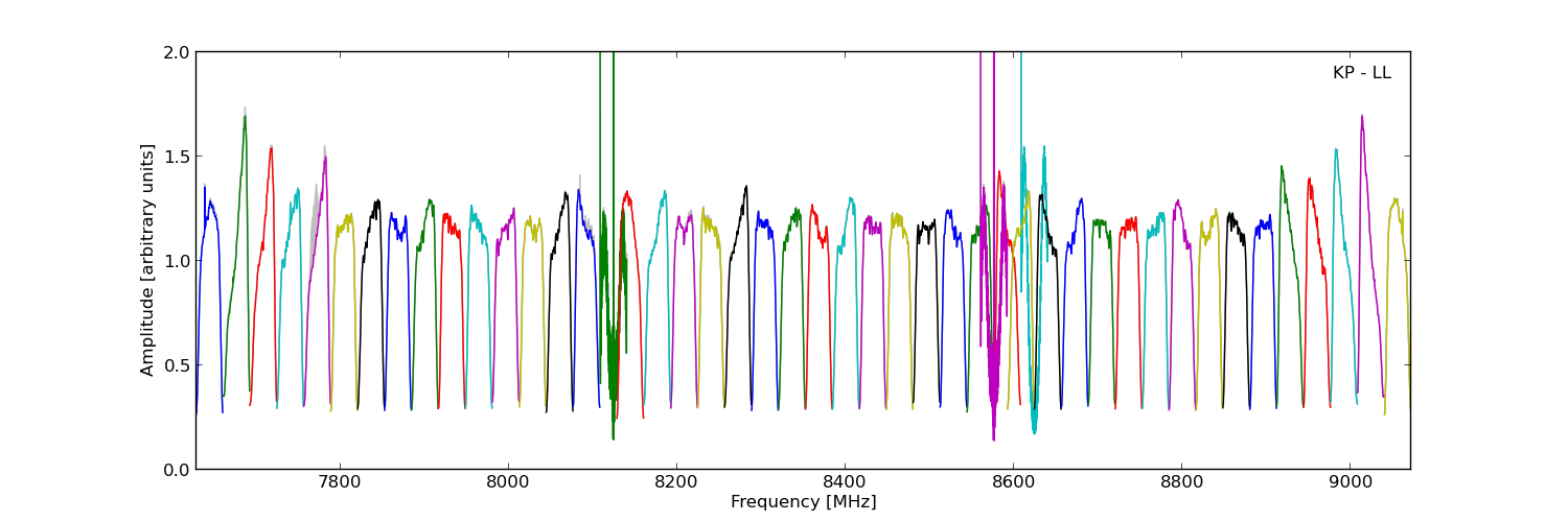 Total power spectrum in arbitrary units. The solid lines indicate the mean value and the shaded area the peaks.