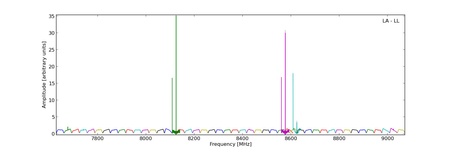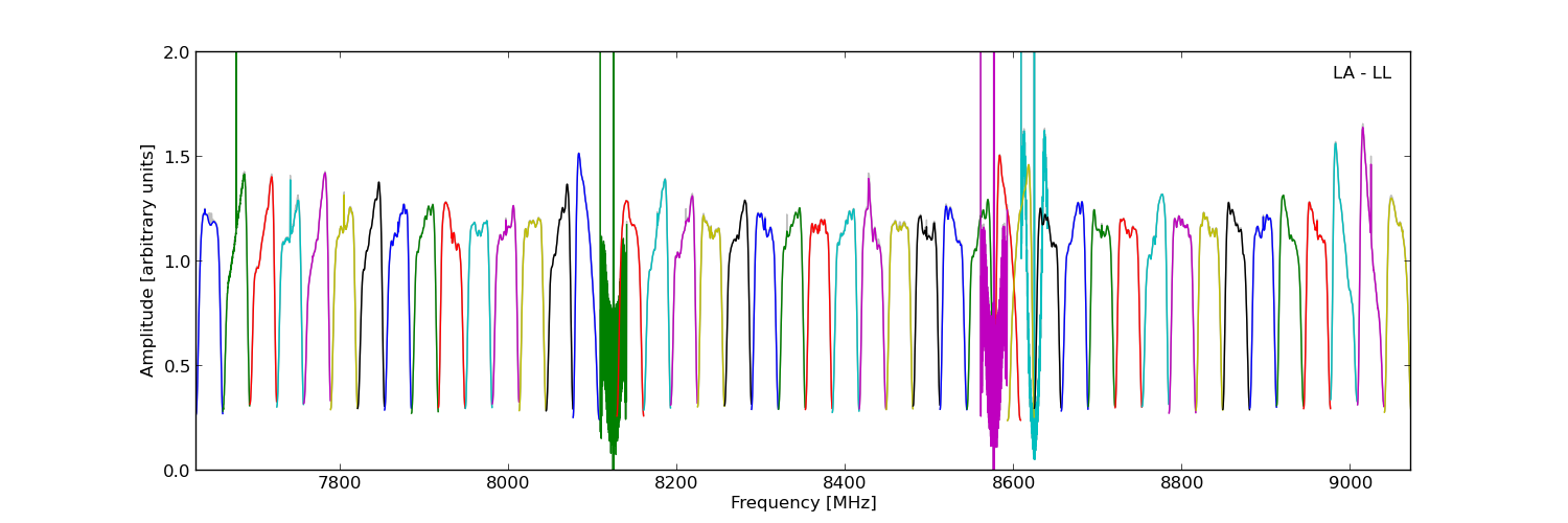 Total power spectrum in arbitrary units. The solid lines indicate the mean value and the shaded area the peaks.