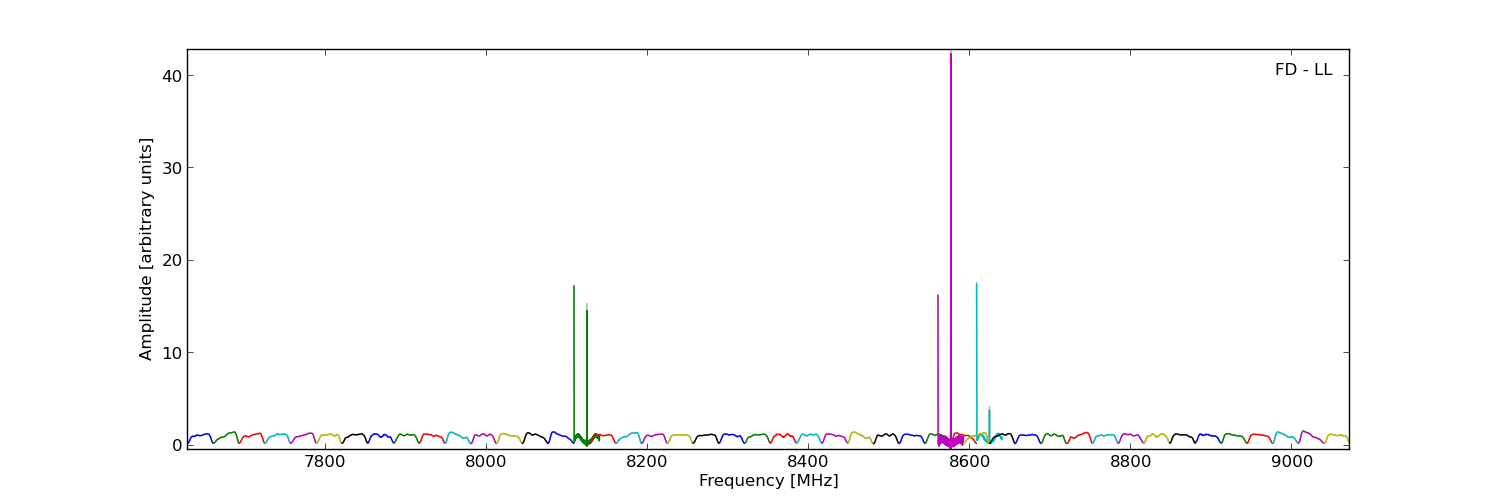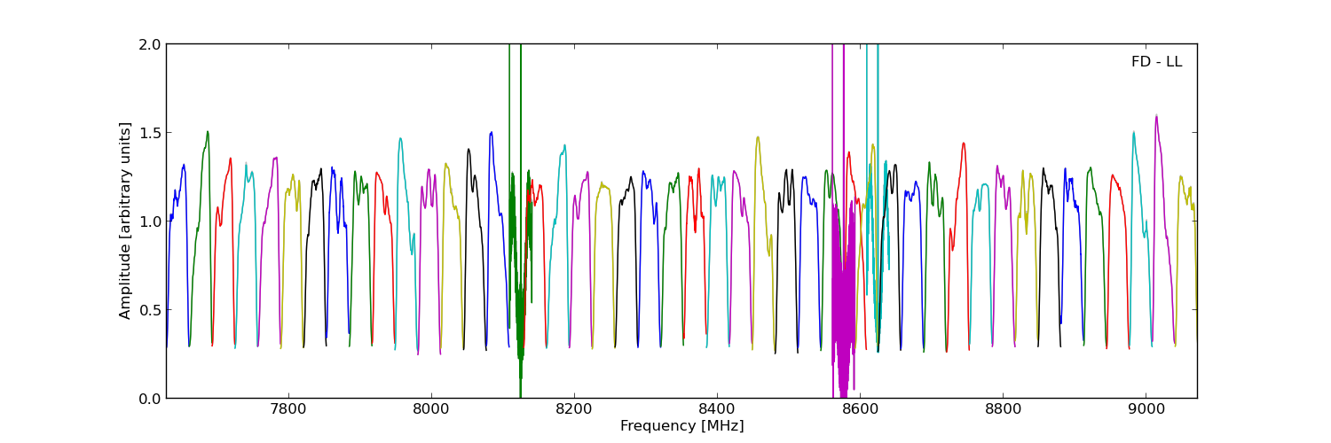 Total power spectrum in arbitrary units. The solid lines indicate the mean value and the shaded area the peaks.