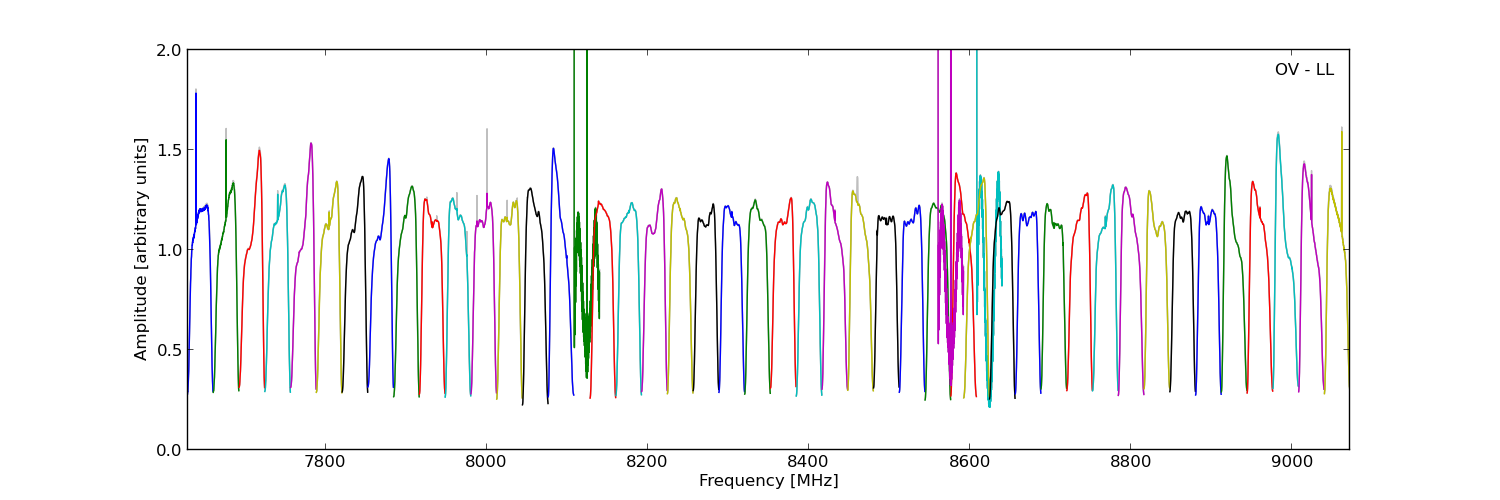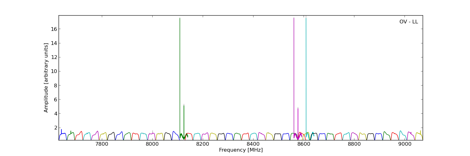 Total power spectrum in arbitrary units. The solid lines indicate the mean value and the shaded area the peaks.