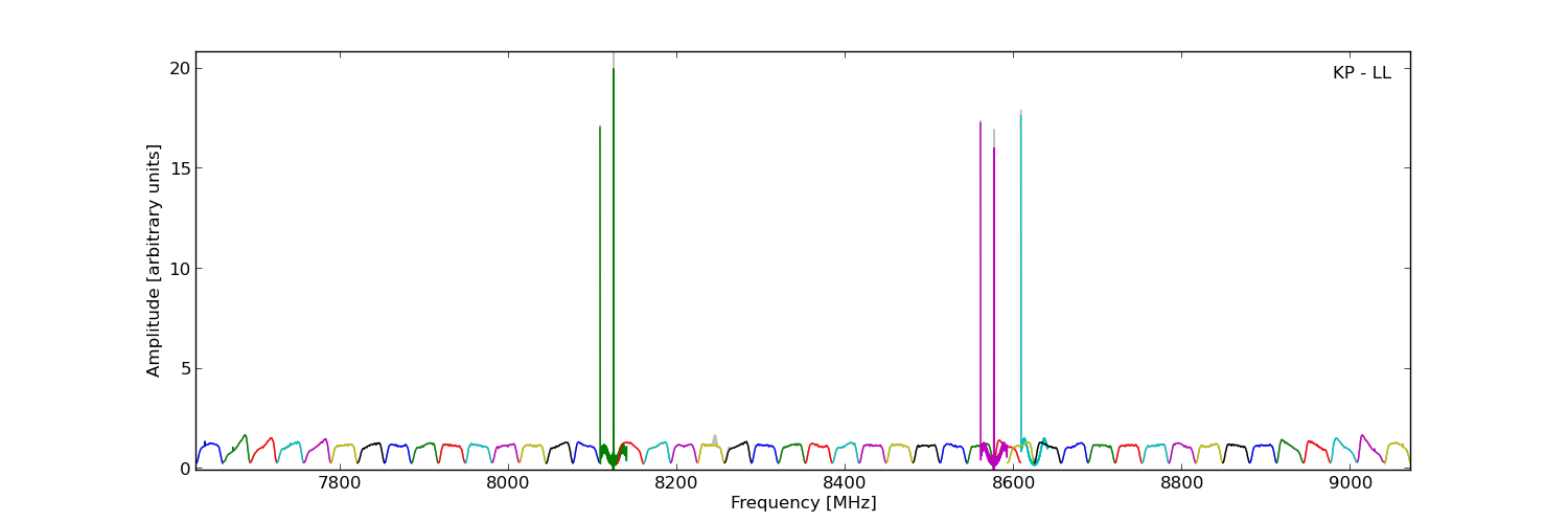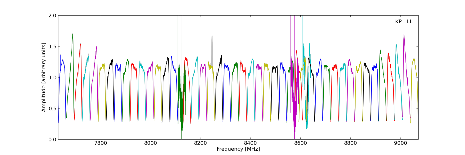 Total power spectrum in arbitrary units. The solid lines indicate the mean value and the shaded area the peaks.