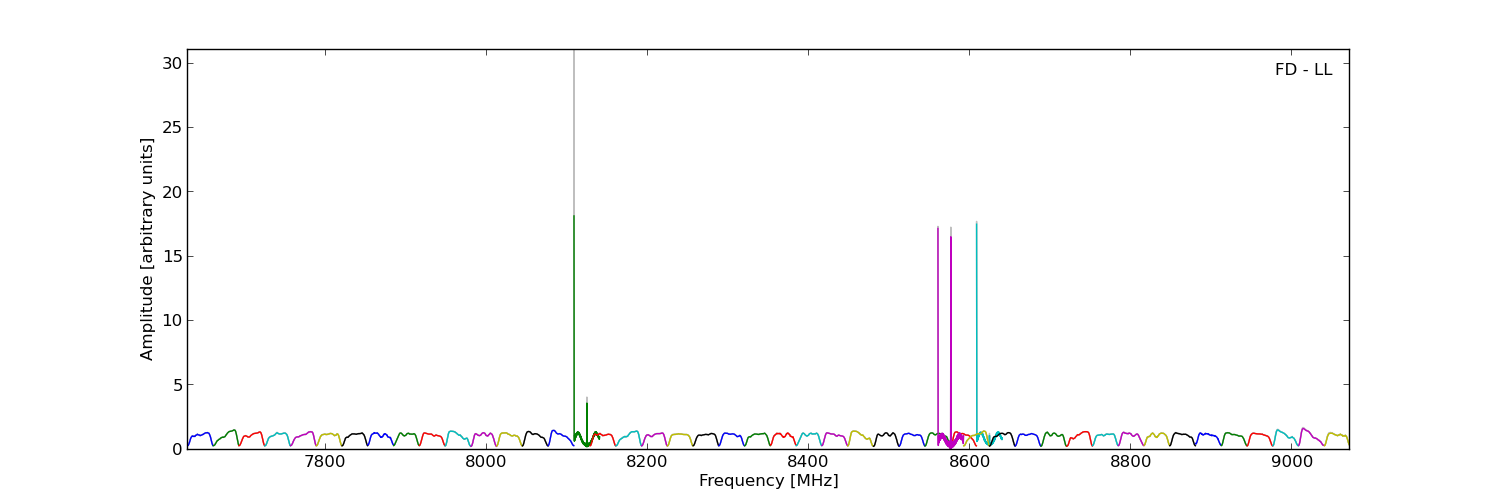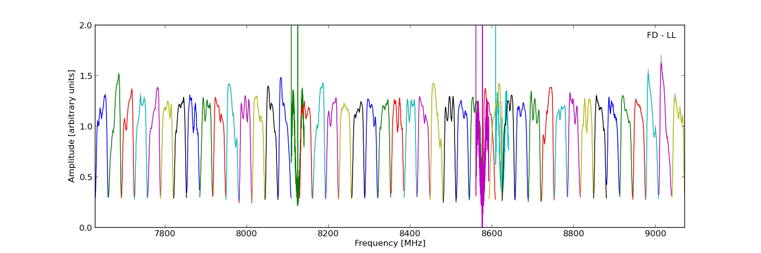 Total power spectrum in arbitrary units. The solid lines indicate the mean value and the shaded area the peaks.