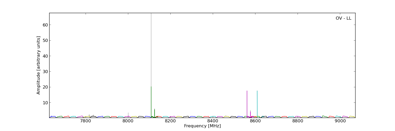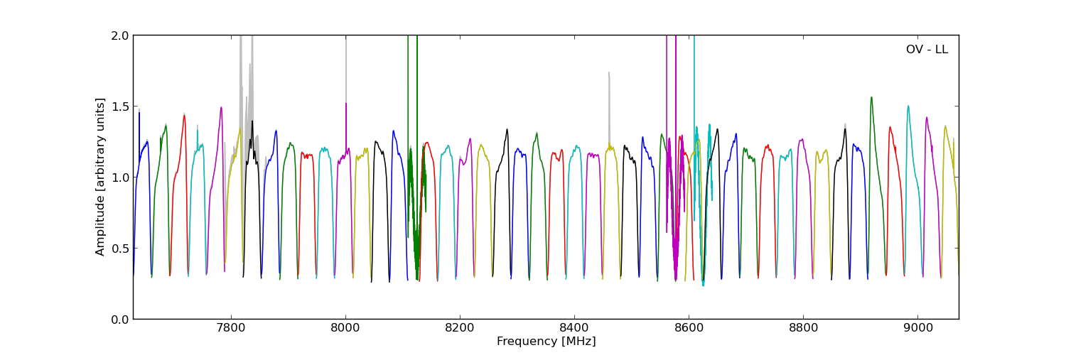 Total power spectrum in arbitrary units. The solid lines indicate the mean value and the shaded area the peaks.