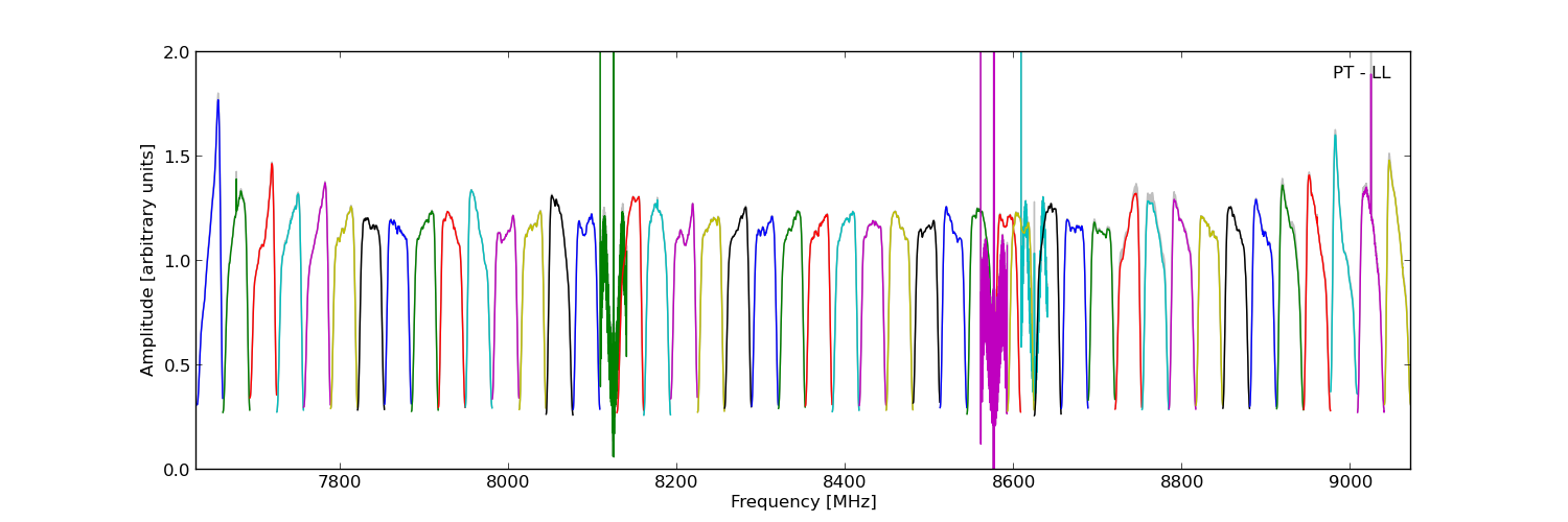 Total power spectrum in arbitrary units. The solid lines indicate the mean value and the shaded area the peaks.
