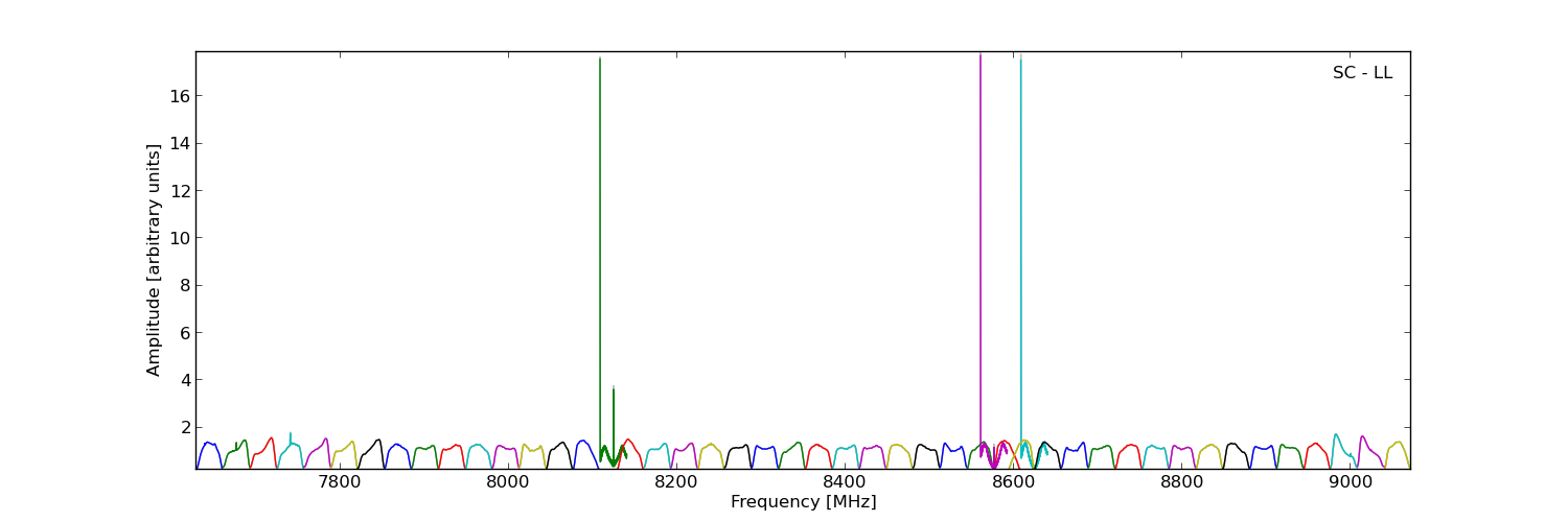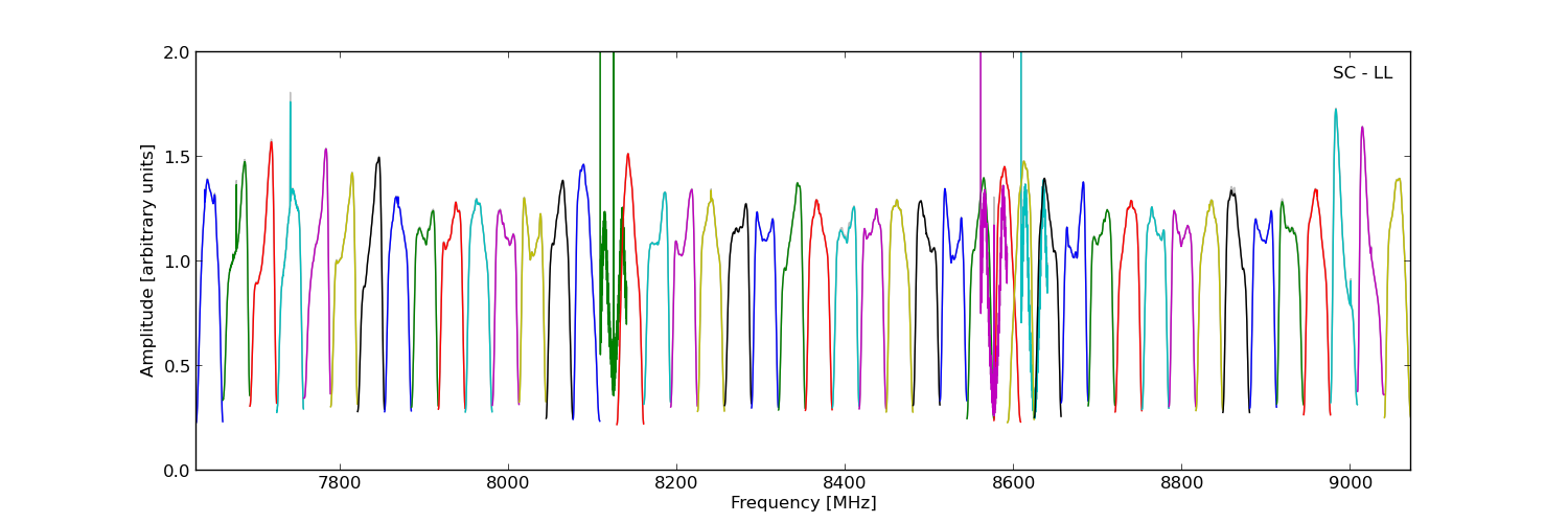 Total power spectrum in arbitrary units. The solid lines indicate the mean value and the shaded area the peaks.