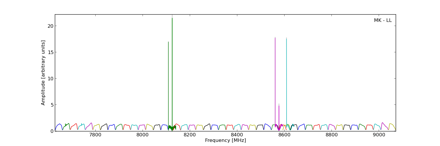 Total power spectrum in arbitrary units. The solid lines indicate the mean value and the shaded area the peaks.