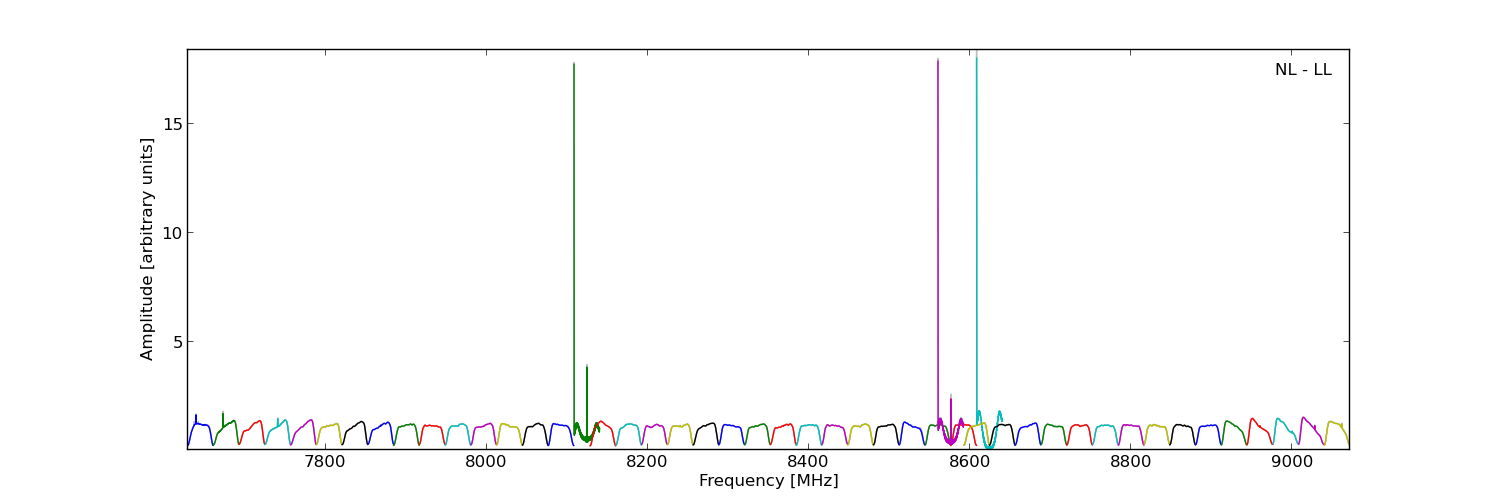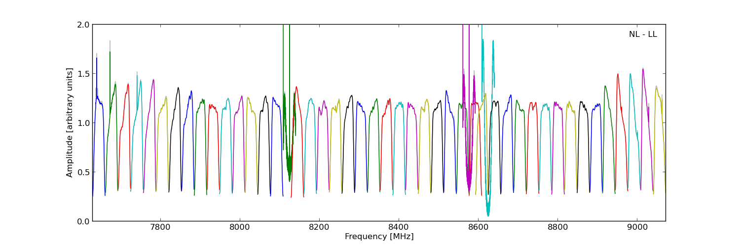 Total power spectrum in arbitrary units. The solid lines indicate the mean value and the shaded area the peaks.