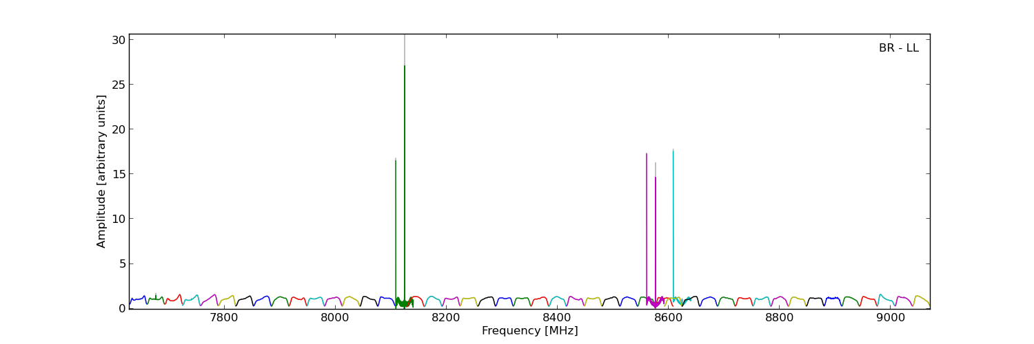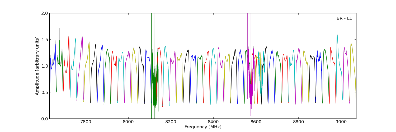 Total power spectrum in arbitrary units. The solid lines indicate the mean value and the shaded area the peaks.
