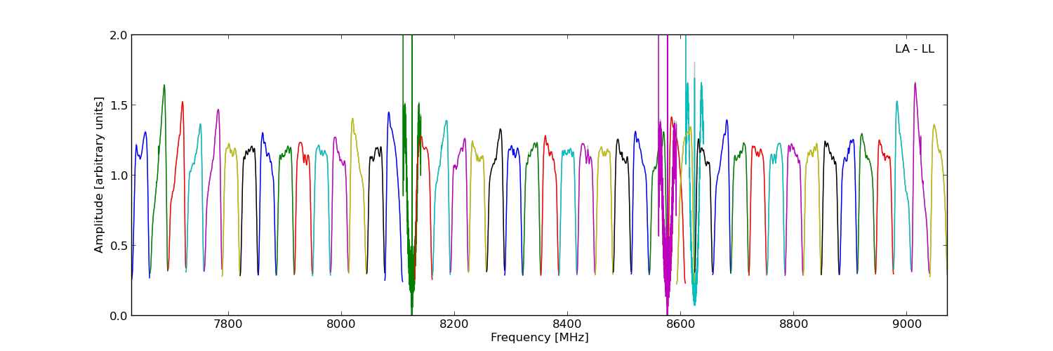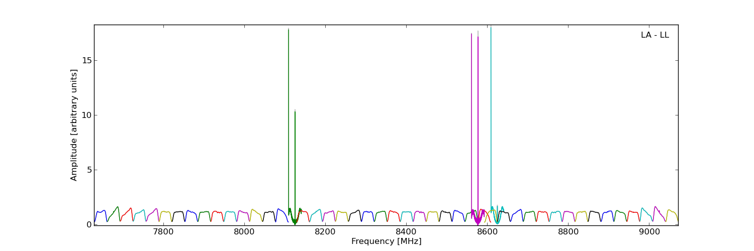 Total power spectrum in arbitrary units. The solid lines indicate the mean value and the shaded area the peaks.