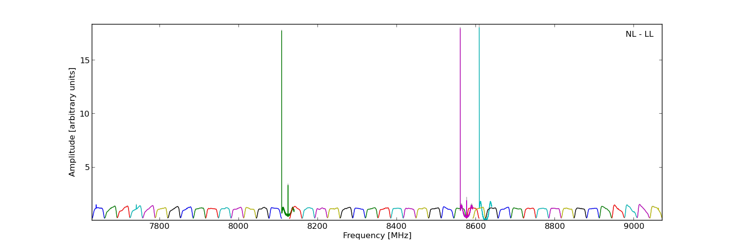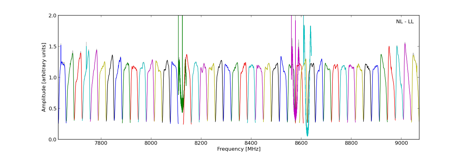 Total power spectrum in arbitrary units. The solid lines indicate the mean value and the shaded area the peaks.