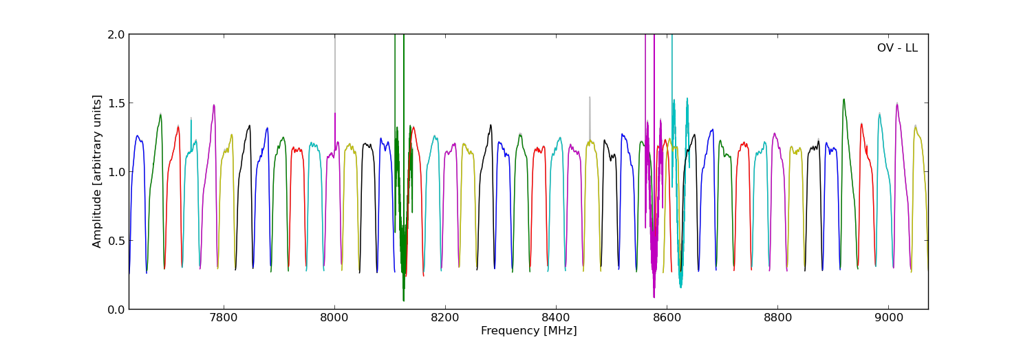 Total power spectrum in arbitrary units. The solid lines indicate the mean value and the shaded area the peaks.